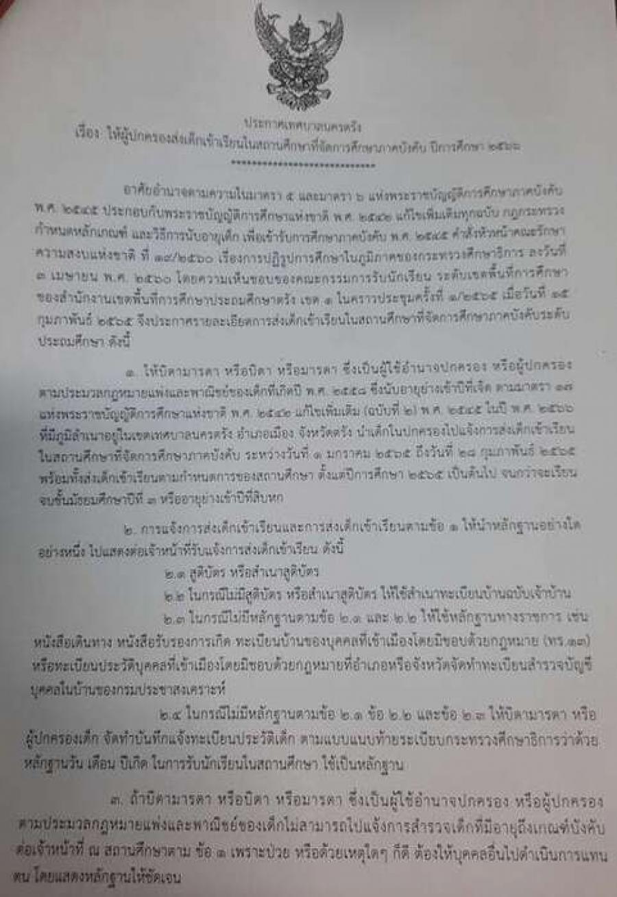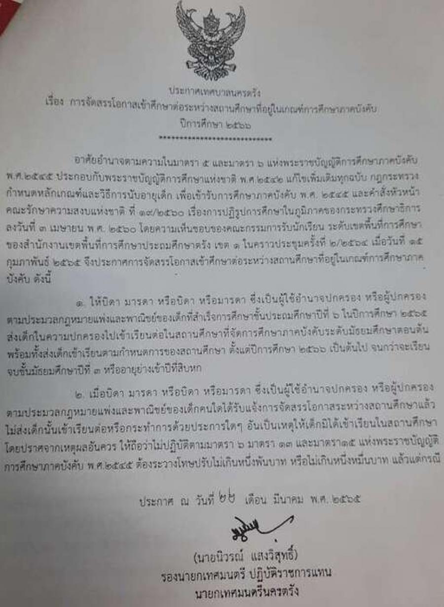 ประกาศ การส่งเด็กเข้าเรียนในสถานศึกษา และการจัดสรรเข้าศึกษาต่อระหว่างสถานศึกษา ปีการศึกษา 2566 S:0