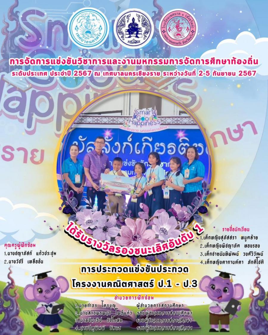 ขอแสดงความยินดีกับทีมการประกวดแข่งขันโครงงานคณิตศาสตร์ ป.1 - ป.3 โรงเรียนเทศบาล ๑ (สังขวิทย์) เทศบาลนครตรัง รางวัลรองชนะเลิศอันดับ 1 การประกวดแข่งขันประกวดโครงงานคณิตศาสตร์ ป.1 - ป.3 ระดับประเทศ การจัดการแข่งขันทักษะวิชาการและงานมหกรรมการจัดการศึกษาท้องถิ่น ระดับประเทศ ครั้งที่ 13 ประจำปี 2567 ณ เทศบาลนครเชียงราย ระหว่างวันที่ 2 - 5 ก.ย.2567 รายชื่อนักเรียน 1. เด็กหญิงสุภัสสรา หนูคล้าย 2. เด็กหญิงพิชญาภัค ทองรอง 3. เด็กชายนันทิพัฒน์ วงศ์วิวัฒน์ 4. เด็กหญิงดากานต์ดา ภักดีโชติ คุณครูผู้ฝึกซ้อม 1. นางชญาภัสก์ แก้วประชุม ชญา ชัยเพชร 2. นางวัชรี เหลืออ้น วัชรี เหลืออ้น อำนวยการฝึกซ้อม 1. นายกำธร ไตรบุญ ผู้อำนวยการสถานศึกษา นายกำธร ไตรบุญ Kamtorn Triboon 2. นางสาวพรพนา โพธิ์แก้ว รองผู้อำนวยการสถานศึกษา 3. นายชินาธิป วัชโรทัย รองผู้อำนวยการสถานศึกษา 4. นางปิตุพิมพ์ วัลแอ รองผู้อำนวยการสถานศึกษา #ขอขอบพระคุณ ดร.สัญญา ศรีวิเชียร นายกเทศมนตรีนครตรัง นายนิวรณ์ แสงวิสุทธิ์ รองนายกเทศมนตรีนครตรัง นายวีร์รัศมิ์ เจือกโว้น รองนายกเทศมนตรีนครตรัง นางสุดใจ ทองย้อย รองนายกเทศมนตรีนครตรัง นายไพศาล เกื้ออรุณ รองนายกเทศมนตรีนครตรัง สมาชิกสภาเทศบาลนครตรังทุกท่าน นายวัลลภ ช่วยบำรุง ปลัดเทศบาลนครตรัง คณะผู้บริหารเทศบาลนครตรัง นางกาญจนา หนูอุไร ผู้อำนวยการส่วนบริหารการศึกษารักษาราชการแทนผู้อำนวยการสำนักการศึกษาและพนักงานสำนักการศึกษาทุกท่าน สำหรับการดูแลโรงเรียนเทศบาล ๑ (สังขวิทย์)ด้วยดีเสมอมา PR Nakorntrang News #ที่สำคัญขาดไม่ได้ ชื่นชมนักเรียนทุกคนและขอบคุณผู้ปกครองนักเรียนโรงเรียนเทศบาล ๑ (สังขวิทย์) สำหรับการสนับสนุนทีมทั้งแรงกายและแรงใจ ติดตามเชียร์และให้กำลังใจเสมอมา S:0